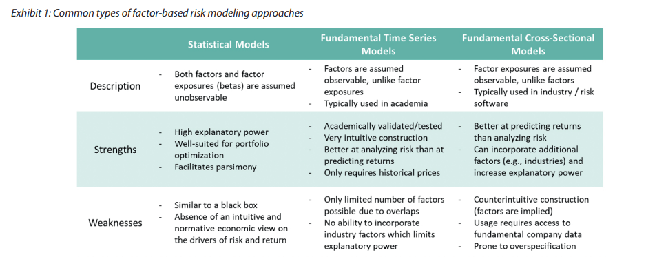 Scientific Portfolio recognizes that building a risk model is perhaps as much of an art as it is a science. There are three common types of factor models used by academics and industry practitioners: i) statistical models, where both factors and factor exposures, i.e., betas, are assumed unobservable and need to be estimated, ii) fundamental time series models which are popular with academics and where factors are assumed observable but not betas, and iii) fundamental cross-sectional models, used by popular risk engines in the industry and where betas are assumed observable but not factors. Exhibit 1 provides a more detailed description and a comparison of the strengths and weaknesses of the three approaches for designing a risk model.