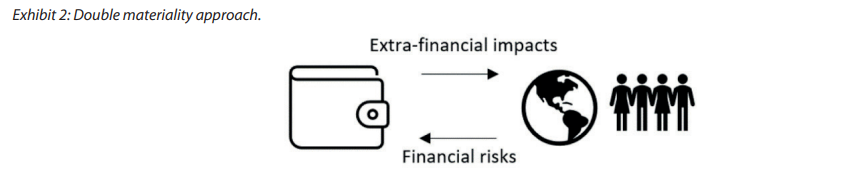 Finally, ESG issues may affect the individual preferences of investors who wish to pursue extra-financial objectives instead of, or in conjunction with, financial objectives. Portfolio construction is also a financial technology that helps investors customize their investments to their own preferences, and Scientific Portfolio offers ESG impact functionalities to investors interested in following a double materiality approach (i.e., both the new financial risks linked to ESG issues and the extra-financial impacts of finance on the environment or on society, see Exhibit 2).