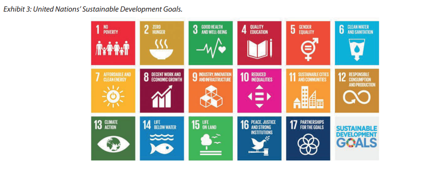 We implement our DNH philosophy by relying on a set of commonly accepted extra-financial objectives, namely the United Nations’ 17 Sustainable Development Goals (SDGs, see Exhibit 3) announced in 2015, which are used by investors to assess and manage the contribution of their portfolio to one or several SDGs. While most of the current SDG frameworks for investors focus on the positive contributions of stocks to SDGs, Scientific Portfolio considers it a priority to identify potential negative contributions to SDGs.